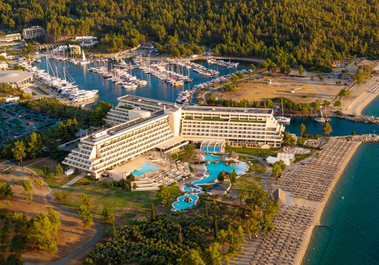 Βρίσκεται πλάι σε μια αμμώδη ακτογραμμή μήκους 9 χιλιομέτρων και περιτριγυρισμένο από μια κατάφυτη έκταση 18.000 στρεμμάτων, με κήπους κάτω από τη σκιά των πεύκων που ντύνουν τις πλαγιές του όρους Μελίτων. Οι εγκαταστάσεις του περιλαμβάνουν ένα γήπεδο γκολφ 18 οπών, τον μεγαλύτερο αμπελώνα βιολογικής καλλιέργειας στην Ελλάδα, ένα κέντρο θαλασσοθεραπείας και ευεξίας, εστιατόρια με γαστρονομία υψηλού επιπέδου, καζίνο και μαρίνα που παρέχει ολοκληρωμένες υπηρεσίες. Επιπλέον, μια μεγάλη γκάμα αθλητικών και πολιτιστικών δραστηριοτήτων σε στεριά και θάλασσα είναι διαθέσιμη σε επισκέπτες κάθε ηλικίας.