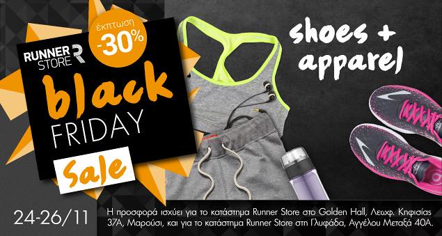 Black Friday στα καταστήματα Runner Store από σήμερα 24-11 με εκπτωση-30% σε ρούχο και παπούτσι. Γιατι στα Runner Store δεν χρειαζεται να περιμένεις μεχρι την Παρασκευή....