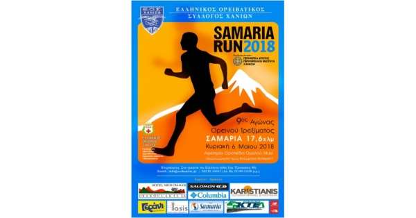 Ο Ελληνικός Ορειβατικός Σύλλογος Χανίων διοργανώνει για ένατη συνεχόμενη χρονιά τον 9ο Αγώνα Ορεινού Τρεξίματος ‘Σαμαριά’ (Samaria Run), ο οποίος θα πραγματοποιηθεί την Κυριακή 6 Μαΐου 2018. Ο Εθνικός Δρυμός Λευκών Ορέων με το Φαράγγι της Σαμαριάς, ο οποίος είναι παγκοσμίως γνωστός, με μεγάλη καθημερινή επισκεψημότητα, θα φιλοξενήσει πάλι την διοργάνωση αυτή. Η διαδρομή που θα ακολουθεί ο αγώνας είναι περίπου 18 km, και είναι Μαχί Ομαλού (Εκκίνηση) – Ξυλόσκαλο – Νερούτσικο – Άγιος Νικόλαος – Καλυβάκι – Ποτιστήρια – Ποριά – Καταφύγιο Καλλέργη – Ξυλόσκαλο Ομαλού, όπου θα γίνει ο τερματισμός. Οι συμμετέχοντες θα τρέξουν στην διαδρομή αυτή σε δρόμο και στα αντίστοιχα μονοπάτια του Εθνικού Δρυμού.