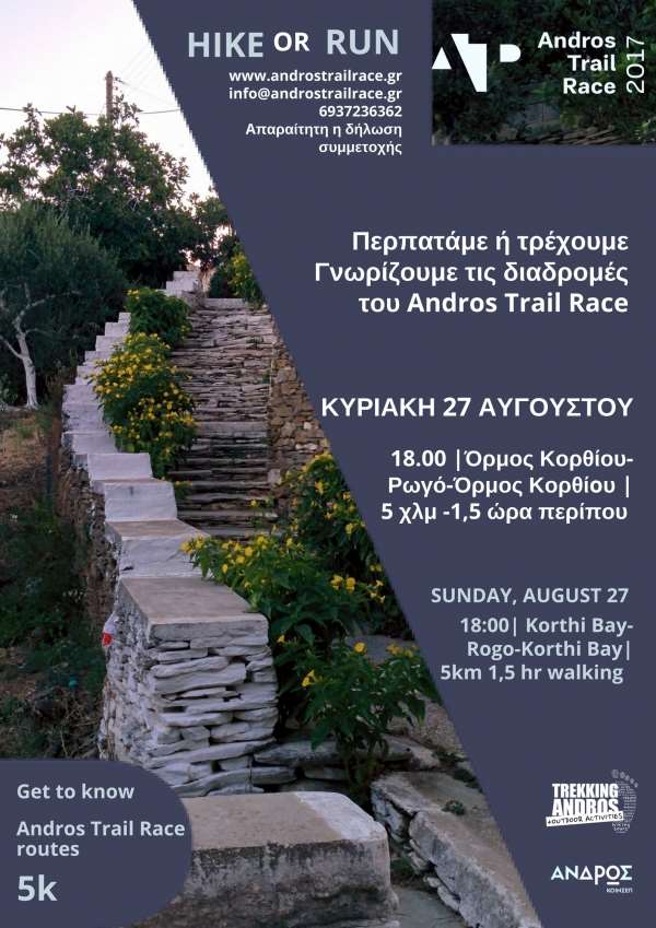 Μια καινούρια διαδρομή κάνει την είσοδο της, μία διαδρομή με εύκολο βαθμό δυσκολίας που απευθύνεται σε όλους άνω των 18 ετών, ιδανική για όποιον επιθυμεί να δοκιμάσει για πρώτη φορά το τρέξιμο στην πόλη και τα προάστιά της. Μία απολαυστική αγωνιστική εμπειρία για κάθε επίπεδο δρομέα ή ενθουσιώδη πεζοπόρου. Ένας συνδυασμός του ορεινού τρεξίματος και του τρεξίματος σε άσφαλτο. Πρόκειται για το παράλληλο αγώνισμα του Andros Trail Race, που θα διεξαχθεί το Σάββατο 30 Σεπτεμβρίου.
