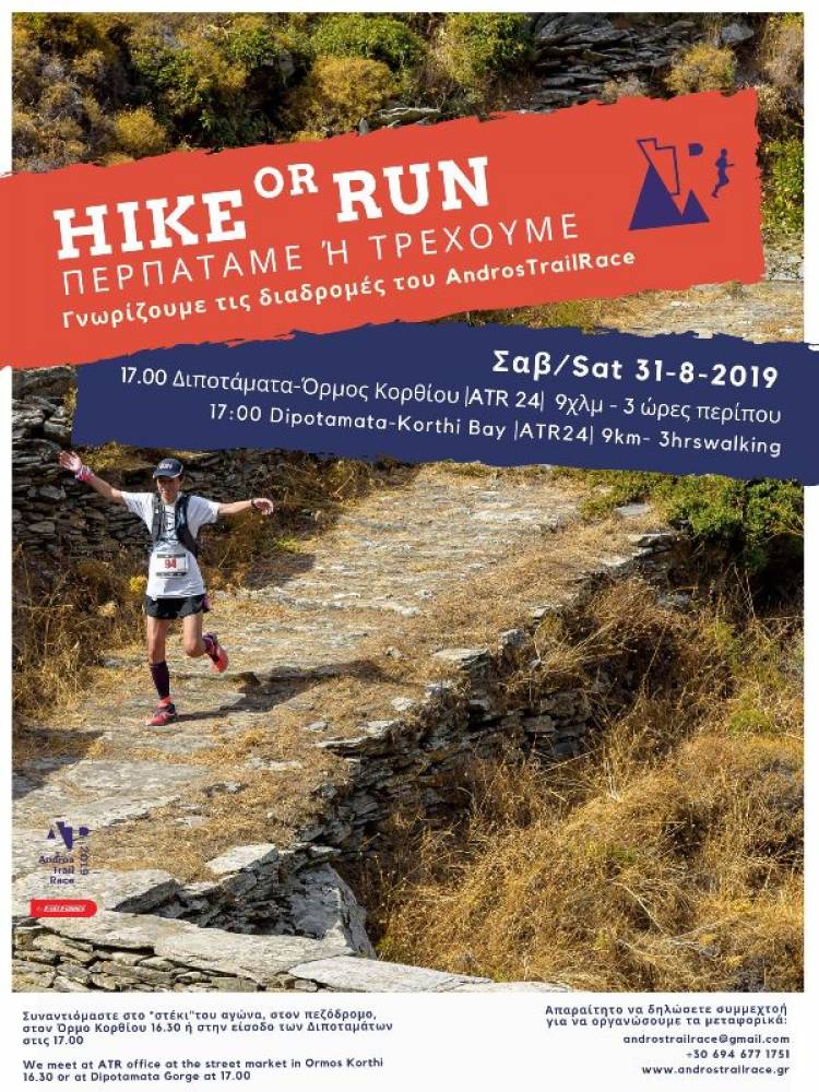 Αυτό το Σάββατο, 31 Αυγούστου, θα περπατήσουμε και πάλι, ένα μέρος της Μεγάλης Κύριας Διαδρομής των 24 χλμ., από τα Διποτάματα έως τον Όρμο Κορθίο, 9χλμ με διάρκεια περπατήματος περίπου 3 ώρες, μέτριας δυσκολίας. Το τμήμα αυτό του αγώνα, διανύει μέρος της πεζοπορικής διαδρομής Andros Routes 3, του δικτύου.