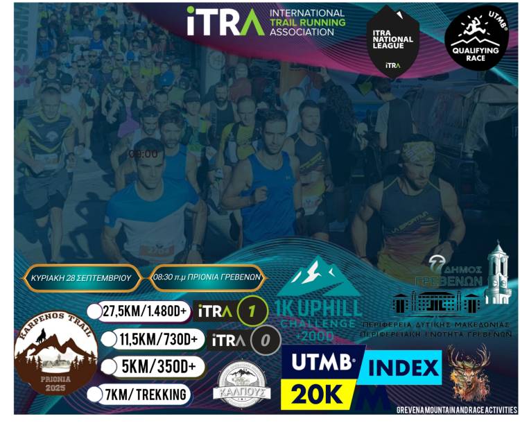 Ο Αθλητικός Ορειβατικός Πολιτιστικός Σύλλογος Πριονίων Γρεβενών «ΚΑΛΠΟΥΣ» διοργανώνει για τρίτη συνεχή χρονιά με την υποστήριξη της ΠΕΡΙΦΕΡΕΙΑΚΗ ΕΝΟΤΗΤΑ ΓΡΕΒΕΝΩΝ και του ΔΗΜΟΥ ΓΡΕΒΕΝΩΝ στις 28/09/2025 την σειρα αγωνων «KARPENOS TRAIL».