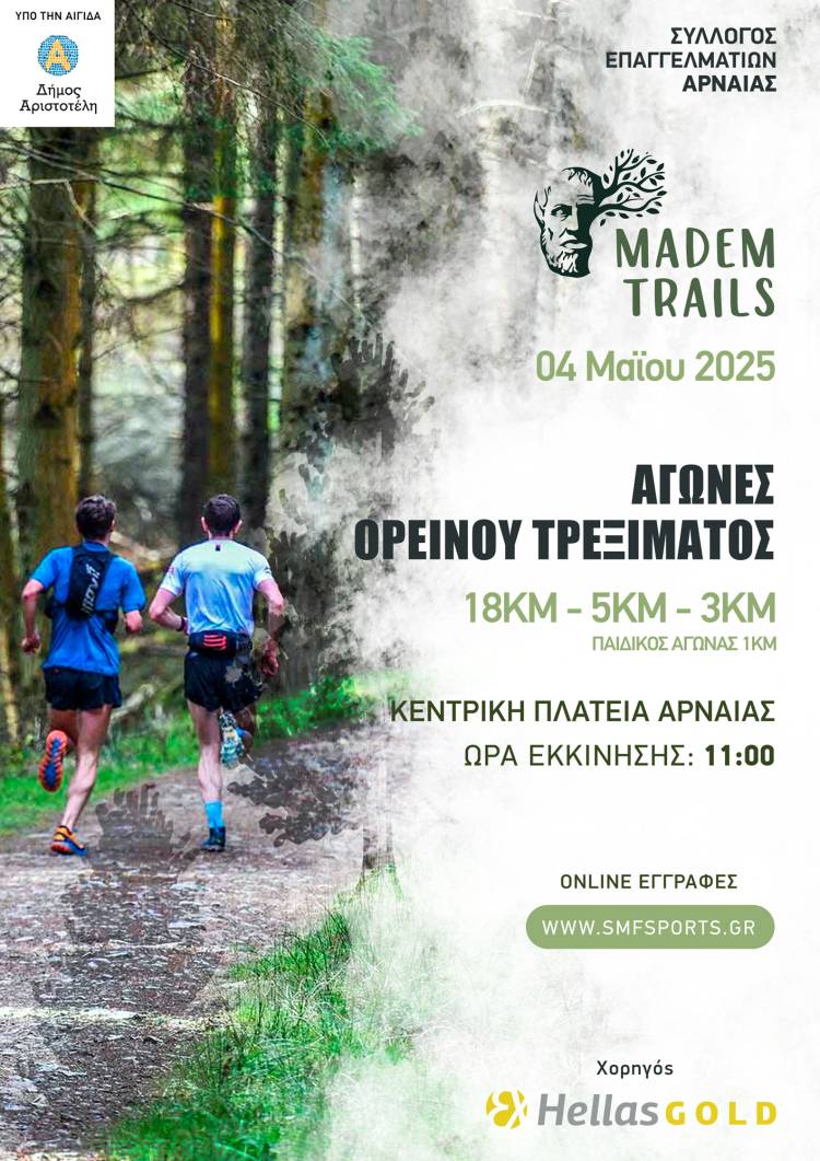 Η οργανωτική επιτροπή του 1ου Αγώνα Ορεινού Τρεξίματος “Madem Trails η οποία αποτελείται από μέλη του Συλλόγου Επαγγελματιών Αρναίας & του Δήμου Αριστοτέλη, ανακοινώνει την έναρξη των εγγραφών της νέας αυτής δρομικής διοργάνωσης, η οποία θα λάβει χώρα την Κυριακή 4 Μαΐου 2025, εντός των ορίων του Δήμου Αριστοτέλη, με σημείο εκκίνησης την πλατεία της Αρναίας και υπό την ευγενική χορηγία της Ελληνικός Χρυσός.