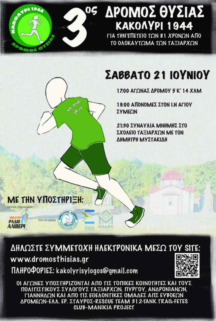Το Σάββατο 21 Ιουνίου 2025, ο Πολιτιστικός Σύλλογος Ταξιαρχών σας προσκαλεί να συμμετάσχετε στον 3ο Δρόμο Θυσίας «Κακολύρι 1944», έναν αγώνα δρόμου αφιερωμένο στην διατήρηση της μνήμης και την τιμή των θυμάτων του Ολοκαυτώματος των Ταξιαρχών (24 Μαΐου 1944). Ο αγώνας αποτίνει φόρο τιμής στους 30 εκτελεσθέντες κατοίκους των Ταξιαρχών και των γειτονικών κοινοτήτων Πύργου, Ανδρωνιάνων και Γιάννηδων, οι οποίοι θυσιάστηκαν από τα γερμανικά ναζιστικά στρατεύματα κατοχής. Η εκκίνηση του αγώνα ορίζεται για τις 17:00 το απόγευμα της 21ης Ιουνίου 2025.
