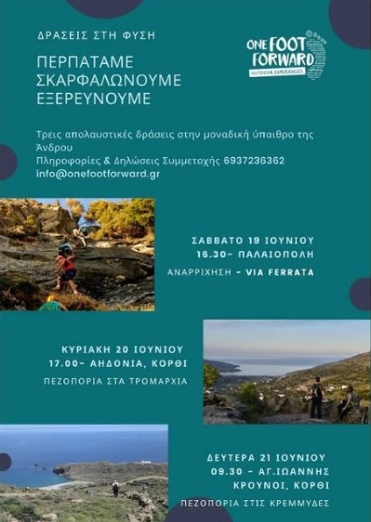 Έρχεται 3ήμερο και σας ετοιμάσαμε τρεις απολαυστικές δράσεις στη μοναδική φύση της Άνδρου. Διάλεξε αυτή που σου ταιριάζει, δήλωσε συμμετοχή και έλα να εξερευνήσουμε τα μονοπάτια και τα βράχια του νησιού.Έρχεται 3ήμερο και σας ετοιμάσαμε τρεις απολαυστικές δράσεις στη μοναδική φύση της Άνδρου. Διάλεξε αυτή που σου ταιριάζει, δήλωσε συμμετοχή και έλα να εξερευνήσουμε τα μονοπάτια και τα βράχια του νησιού.
