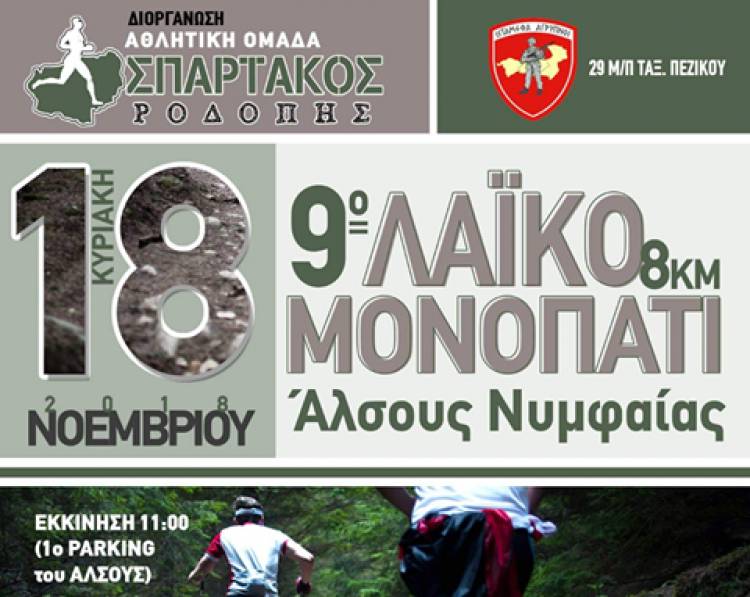 Η αθλητική ομάδα Σπάρτακος Ροδόπης και η 29 μ/π ταξιαρχία πεζικού διοργανώνουν για 9η συνεχόμενη χρονιά τον αγώνα ορεινού τρεξίματος "λαϊκό μονοπάτι άλσους νυμφαίας".ο αγώνας μηκους 8 χιλιομέτρων και 300 μέτρων θετικής υψομετρικης θα διεξαχθεί την Κυριακή 18 Νοεμβρίου 2018 και ώρα εκκίνησης 11.00 το πρωί από το πάρκινγκ του άλσους!.