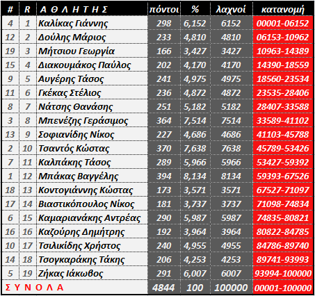Κατόπιν, ο συνολικός αυτός αριθμός των 4844 βαθμών μετατράπηκε σε ένα σύνολο 100.000 λαχνών, όσοι δηλαδή και οι λαχνοί που θα βρίσκονται στην κληρωτίδα του Πρωτοχρονιάτικου Λαχείου, στις 31 Δεκεμβρίου 2012. Η κατανομή του πλήθους των λαχνών σε κάθε αθλητή έγινε με βάση το ποσοστό στο σύνολο των βαθμών του πίνακα. Έτσι, στον πρώτο αθλητή αντιστοιχούν 8134 λαχνοί (ποσοστό 8,134% στο σύνολο των βαθμών)και στον τελευταίο 3427 λαχνοί (ποσοστό 3,427% στο σύνολο των βαθμών). Μετά την τελική κατανομή των λαχνών έγινε ανακατανομή των θέσεων των 19 αθλητών στον πίνακα, προκειμένου να βρεθούν σε μια τυχαία σειρά. Η ανακατανομή με τυχαία σειρά (randomization)έγινε από ειδικό πρόγραμμα.