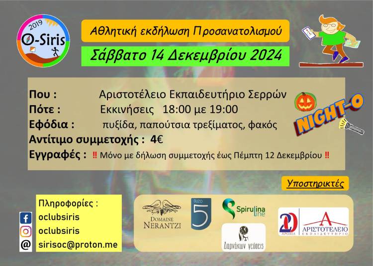 Ο σύλλογος αθλητικού προσανατολισμού Σερρών ‘Ο-Σίρις’ διοργανώνει αθλητική εκδήλωση νυχτερινού προσανατολισμού (night orienteering), το Σάββατο το βράδυ, 14 Δεκεμβρίου 2024 στις εγκαταστάσεις του Αριστοτέλειου Εκπαιδευτήριου Σερρών στις Σέρρες. Το σημείο συγκέντρωσης (γραμματεία) θα είναι η είσοδος στην αυλή του σχολείου.