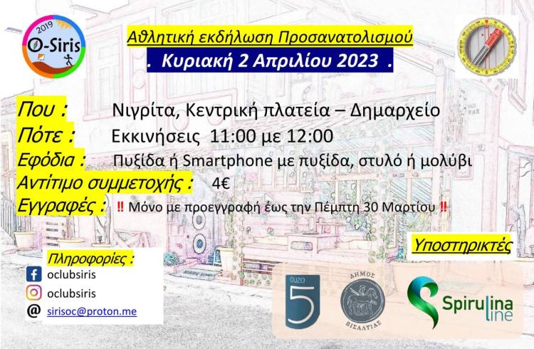 διοργανώνει αθλητική εκδήλωση προσανατολισμού (orienteering) την Κυριακή 2 Απριλίου 2023 στη Νιγρίτα. Το σημείο συγκέντρωσης (γραμματεία) θα είναι η πλατεία μπροστά από το δημαρχείο της Νιγρίτας επί της οδού Ηρώων.