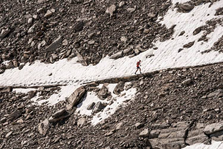 The Royal Ultra SkyMarathon – pure skyrunning over moraine and snowfields at 3,000m altitude, site of the 2023 Masters Skyrunning World Championships. ©iancorless.com